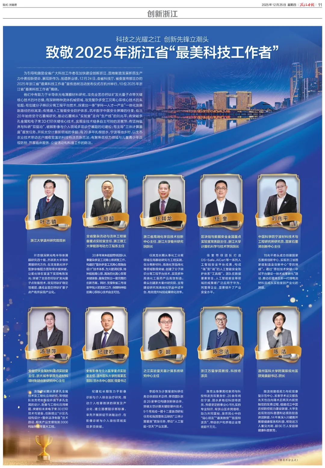 据悉,2025年浙江省“最美科技工作者”宣传选树活动自启动以来,得到了社会各界广泛关注,共产生10位“最美科技工作者”。
