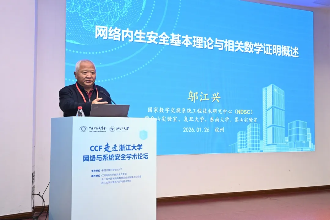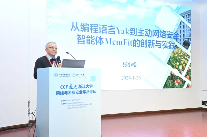 1月26日,由中国计算机学会(CCF)主办、CCF网络与系统安全专委会、浙江大学区块链与数据安全全国重点实验室、浙江大学计算机科学与技术学院共同承办的“CCF走进浙江大学”网络与系统安全学术论坛在玉泉校区举办。论坛汇聚两院院士和高校顶尖专家学者,围绕网络与系统安全、人工智能安全、密码与数据安全等关键方向,深入探讨基础理论突破、核心技术演进与未来安全范式,来自学术界、产业界的各方代表300余人出席。